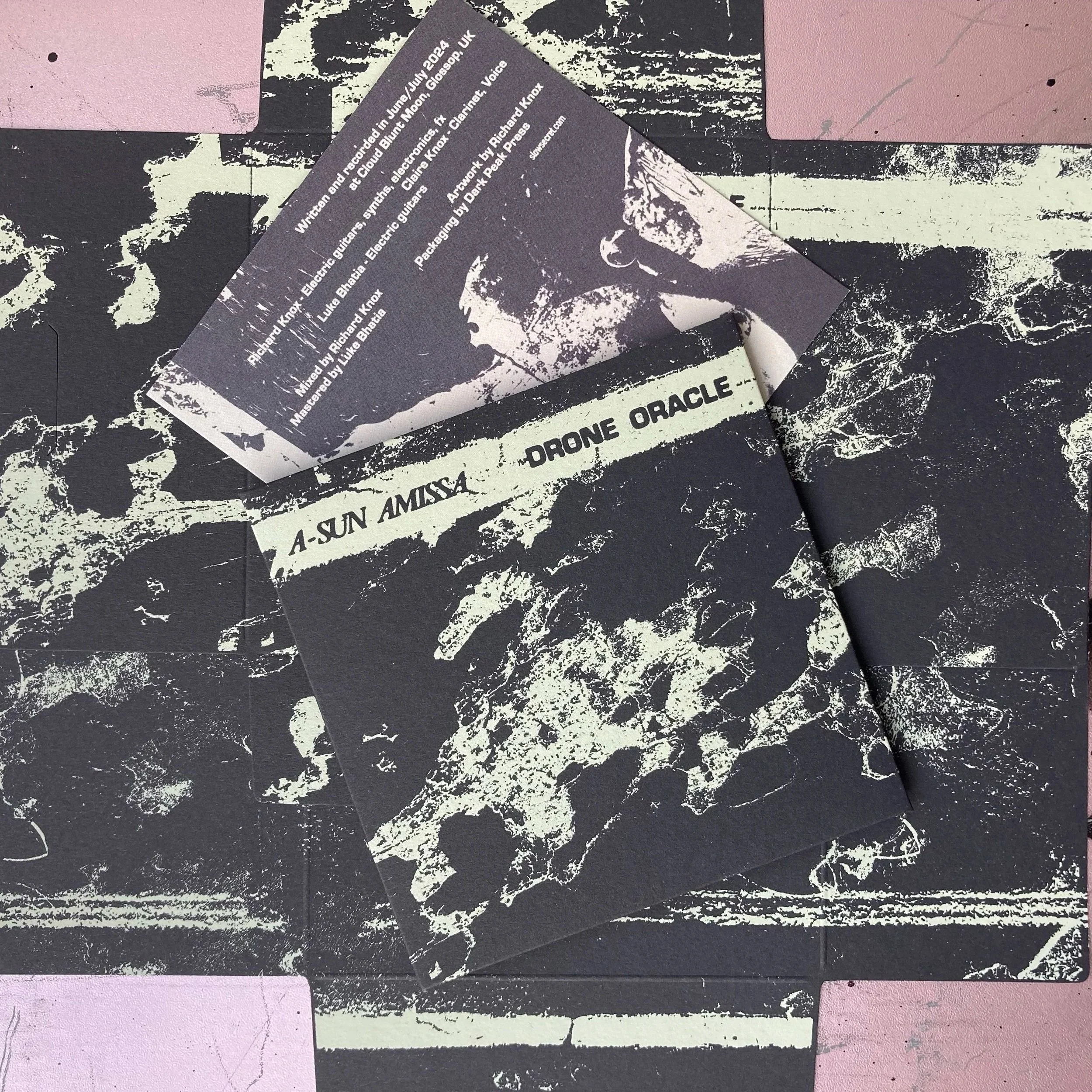 Written and recorded over a few weeks at the bands home studio in Glossop, 'Drone Oracle' unites a host of the various strands of sound that A-Sun Amissa have developed over it's now 14 year existence. Creeping ambient movements, coupled with choral and electronic elements eventually give way to a crushing, spaced-out dual-guitar dirge that's complimented perfectly with some blissful, blown-out free jazz clarinet.